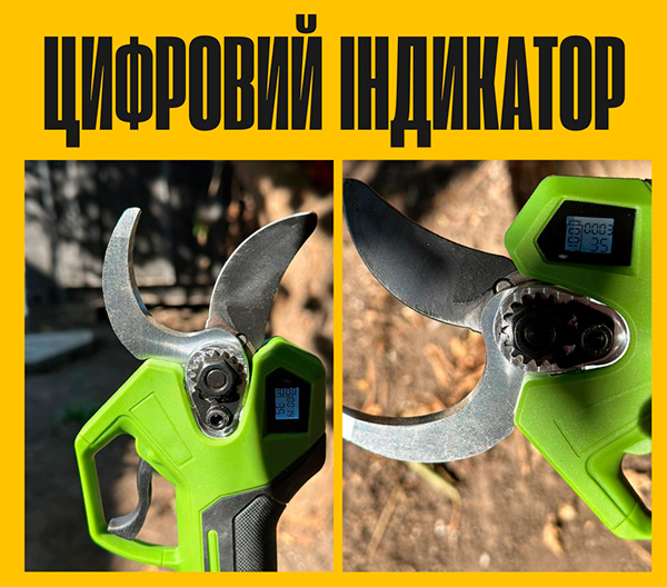 На цифровому дисплеї електроСекатора Procraft показуються три основні параметри: