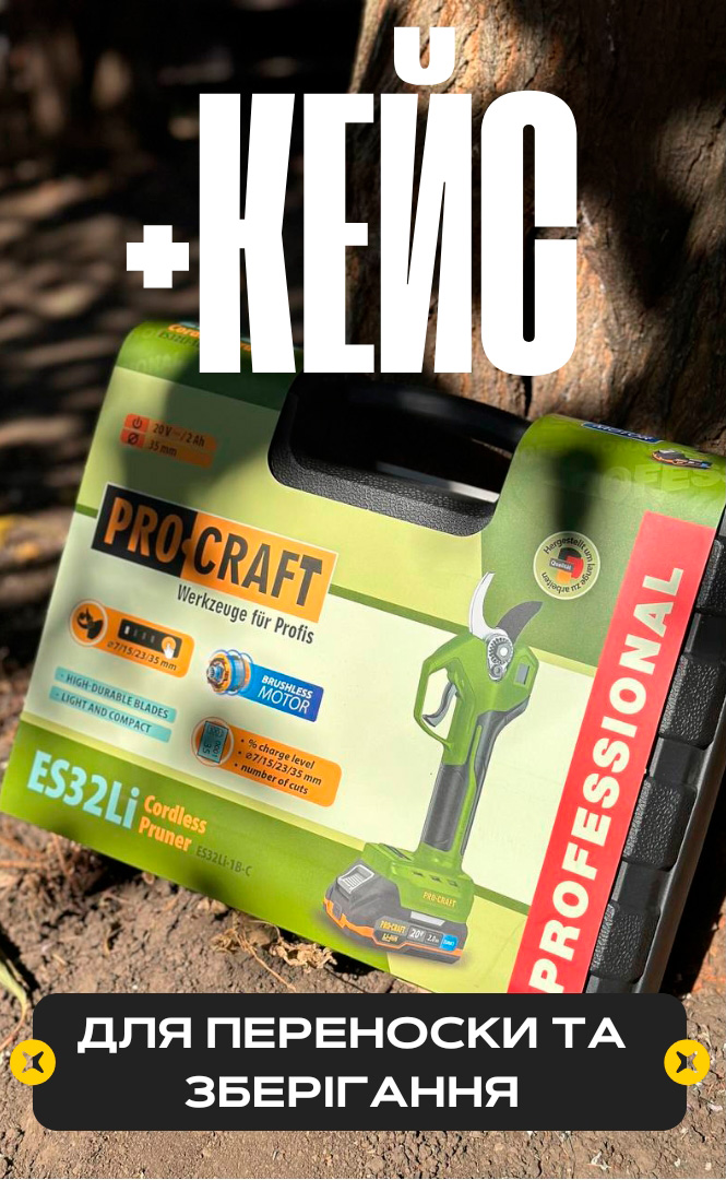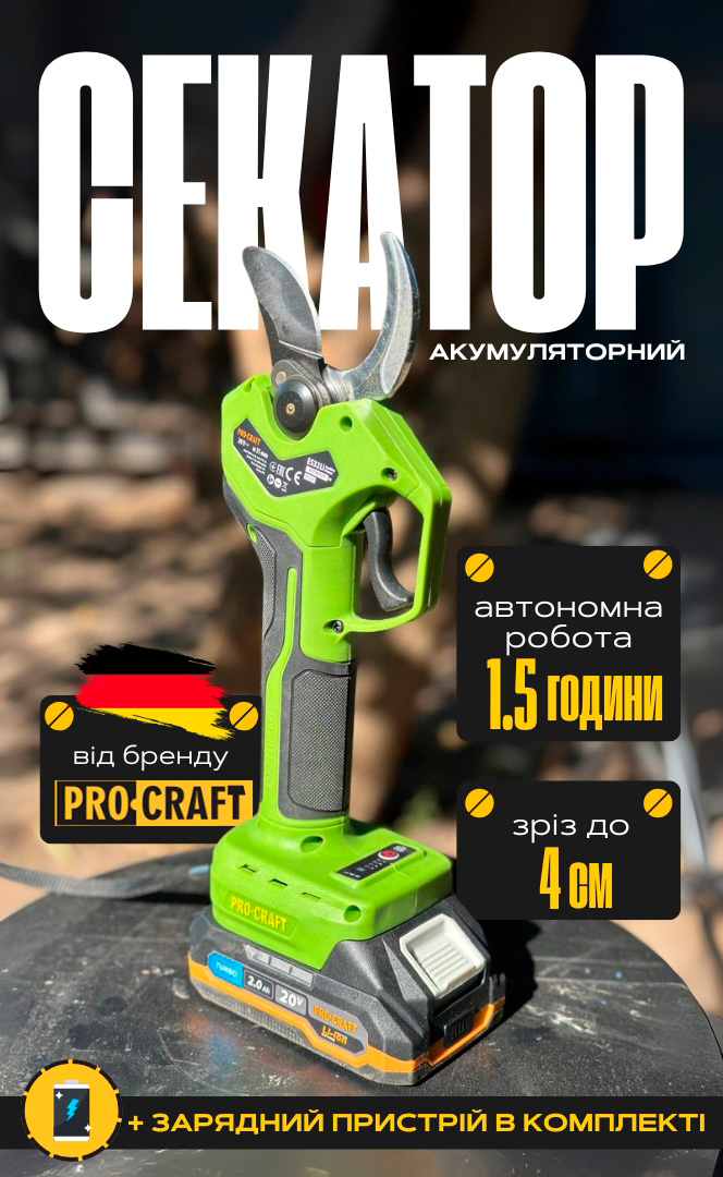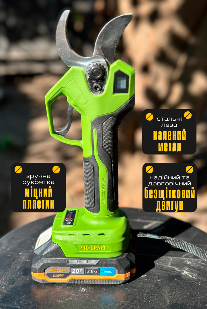 Акумуляторний Секатор PROCRAFT оснащений безщітковим двигуном і високовуглецевими лезами, що забезпечують високу ефективність і довговічність. Він легко справляється з обрізанням молодих пагонів і тонких гілок, забезпечуючи стабільну роботу навіть під час інтенсивних завдань.